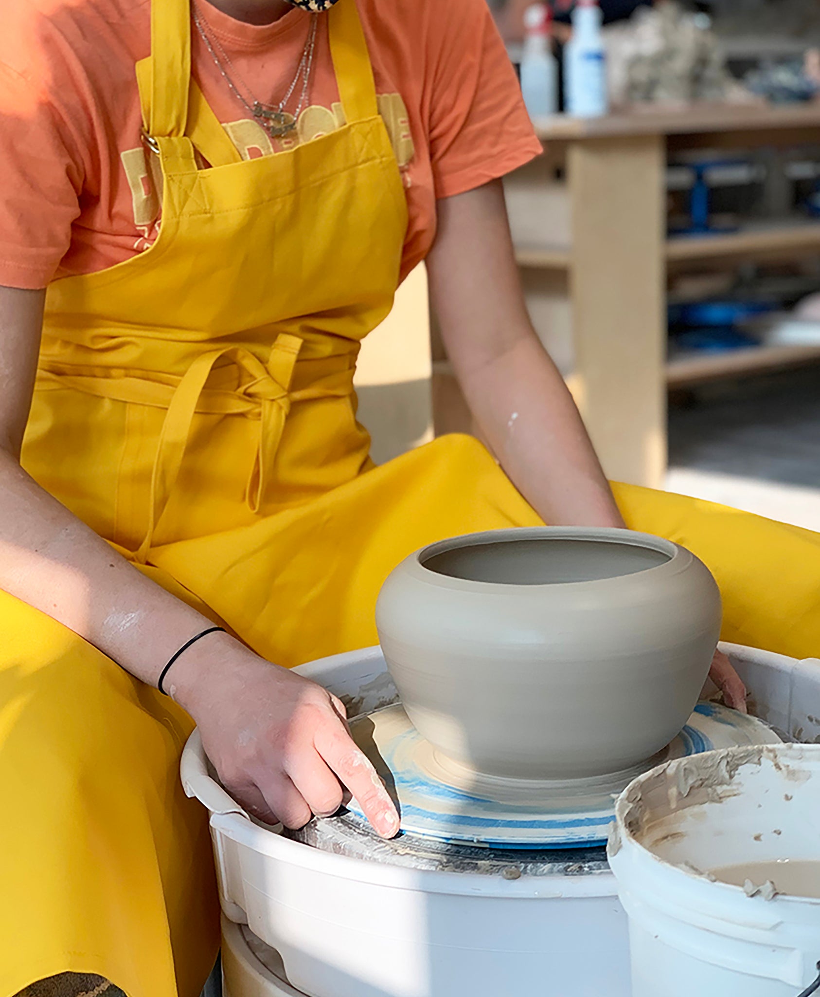 Designed by Leslie King in collaboration with BKLYN CLAY and our need for an apron that would keep the Brooklyn Red off your white jeans - before, during and after your messy work. This apron is multi-functional, cook a turkey, throw a pot, and look good doing it. Designed to be worn around the neck or folded-over at the waist.
