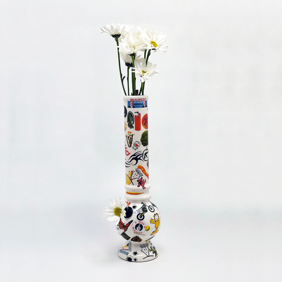 Ceramic decals on classic slipcast vase/bong.