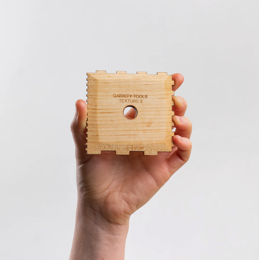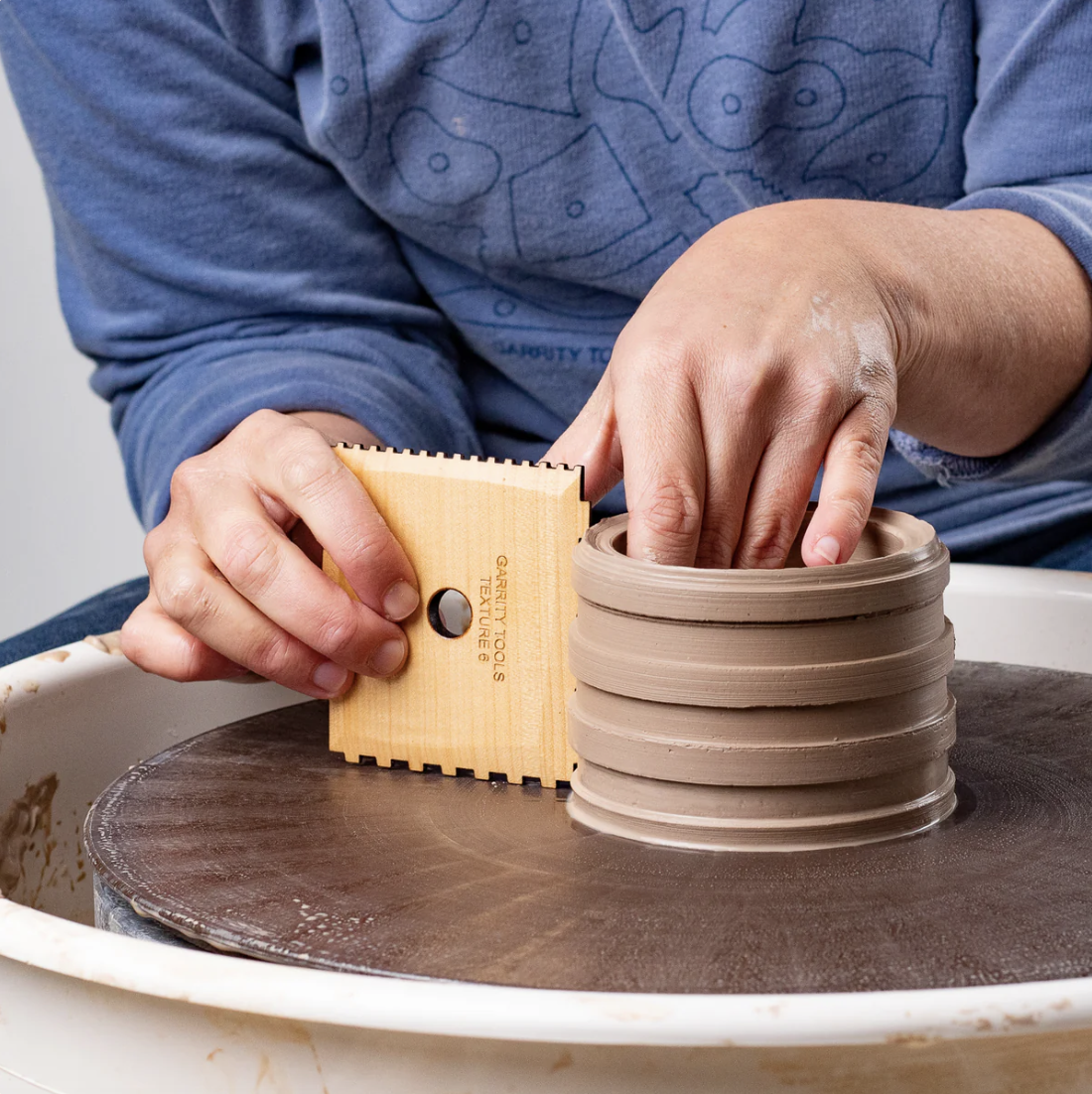 Texture 6 helps you create squared ridges with four different sizes of our most geometric textures. Each side of the Texture 6 pottery tool provides a different pattern that allows you to make a unique yet consistent texture on your vessel or slab and develop new forms in your work.